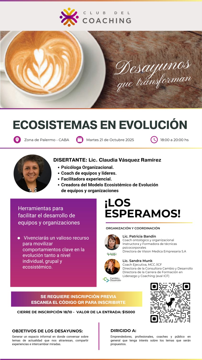 Te invitamos a compartir una merienda presencial muy especial, donde recibiremos a Claudia Vásquez, creadora del Modelo Ecosistémico de Evolución de Equipos y Organizaciones y de las Cartas de Evolución, una herramienta práctica y visual que impulsa conversaciones colaborativas y transformadoras en equipos y organizaciones.